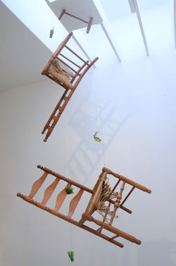 The words: HAVE A SEAT. EVERYTHING IS PERMANENT are burned into the back of a decaying chair. Viewers are invited to sit and test the truth of this statement while comtemplating the family of suspended chairs and broken glass emerging and receding within the landscape of the gallery. EVERYTHING IS PERMANENT creates an uneasy story of precarious change, inviting the viewer to question the notion of stability, permanence, and the space beyond what we can see.